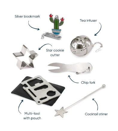 Each Cracker contains a Hat, Satisfying Snap, Amusing Joke/Motto & one of the following Gifts: Gold Flower Bookmark, Silver Fish & Chip Fork, Mini Grater, Silver Multi-tool, Reindeer Keychain & Silver Shoehorn.